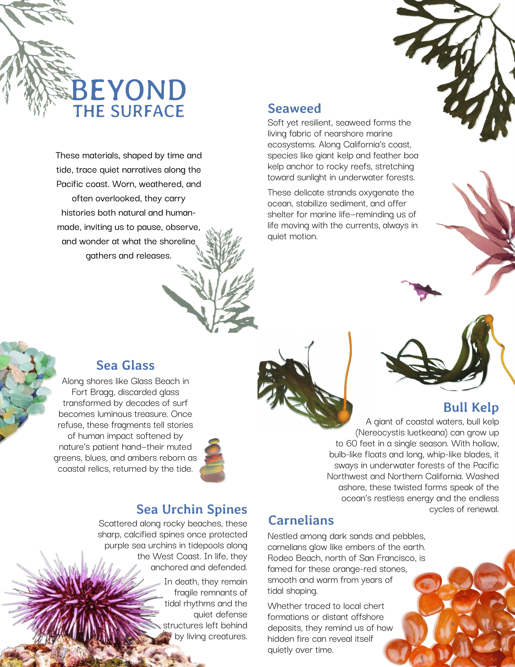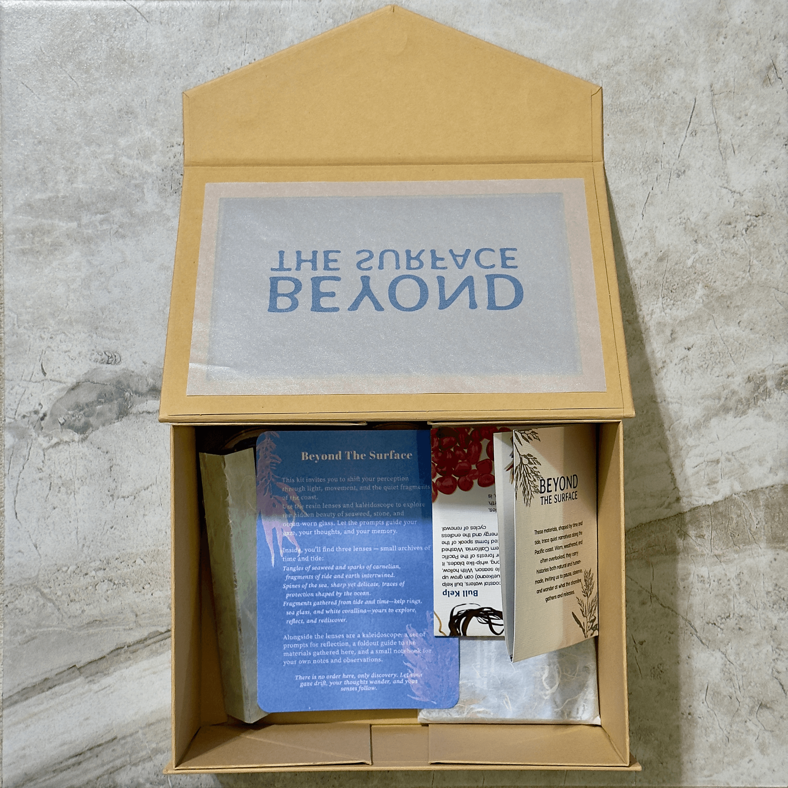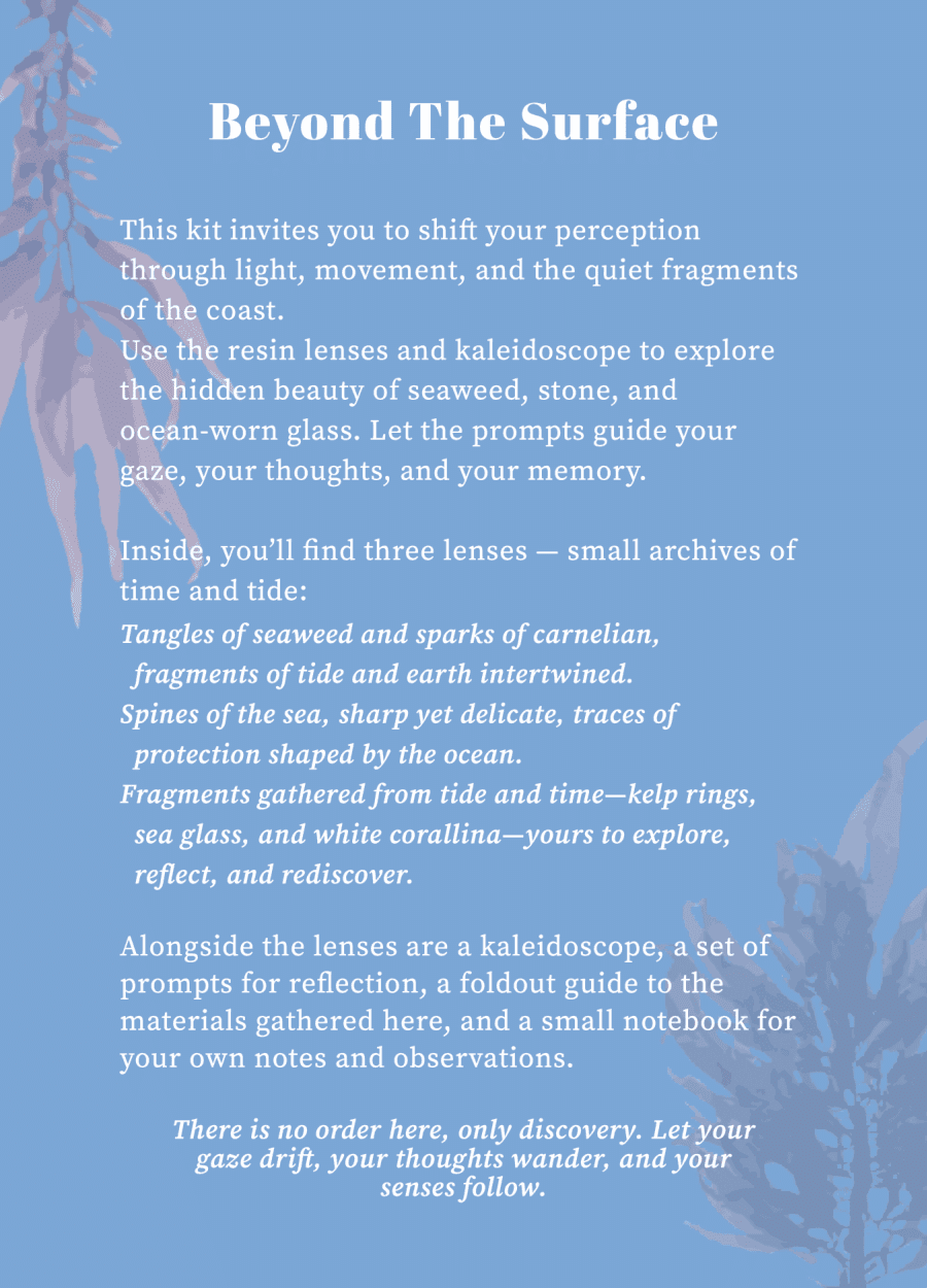 A quiet archive of the coast’s understory, this kit gathers seaweed, kelp, carnelians, sea glass, urchin spines, and corallina—materials shaped by tide and often overlooked. Through these fragments and a series of layered prompts, it invites you to reimagine what the shoreline forgets—and what perception might recover.