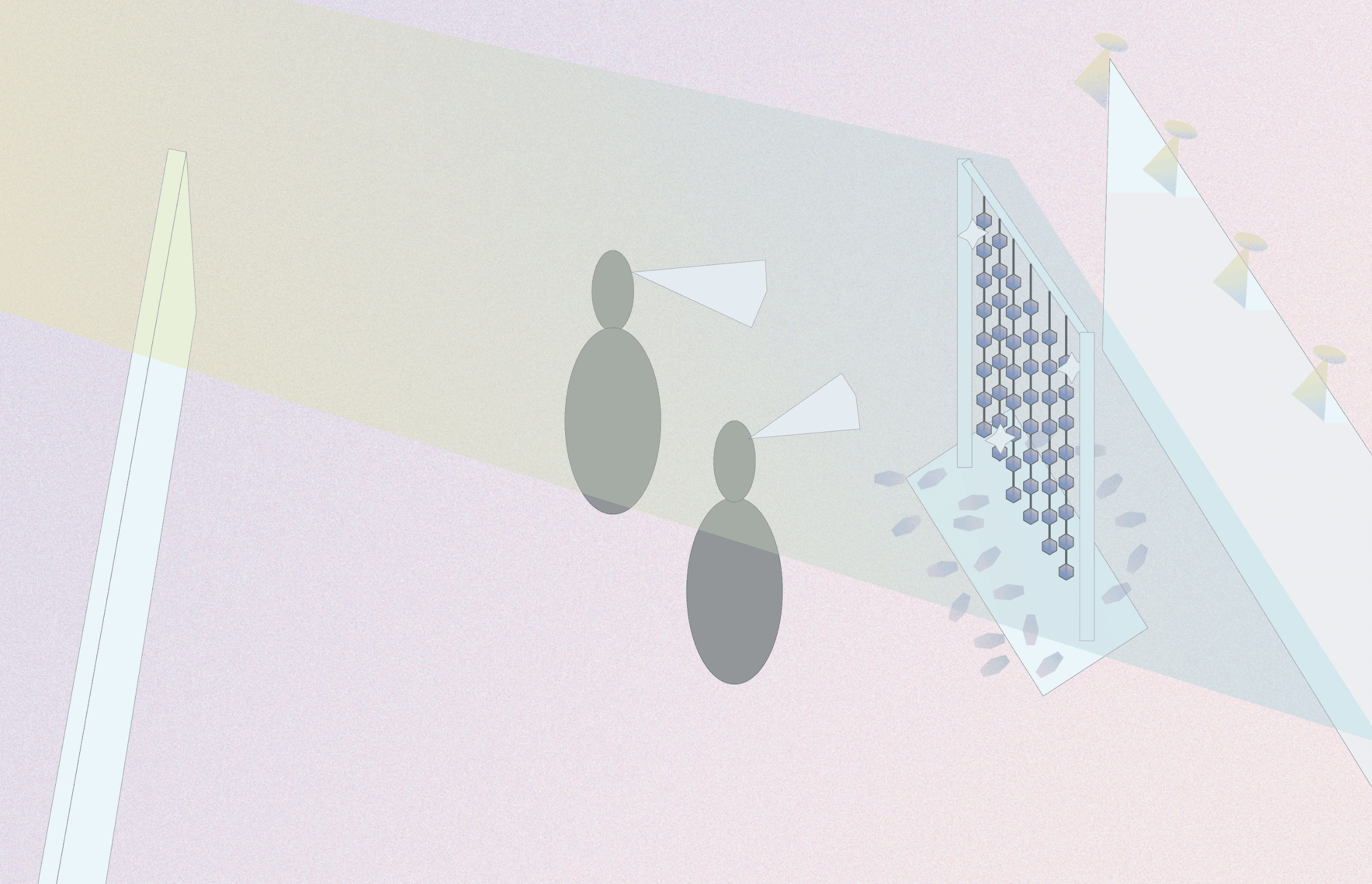Mirrored Interlude transforms everyday moments into luminous, shared reflections. Installed at the entrance of CCA’s PLAySPACE gallery, it draws in passersby through an iridescent interplay of light, cut acrylic, and shifting color—activated by presence and movement.
